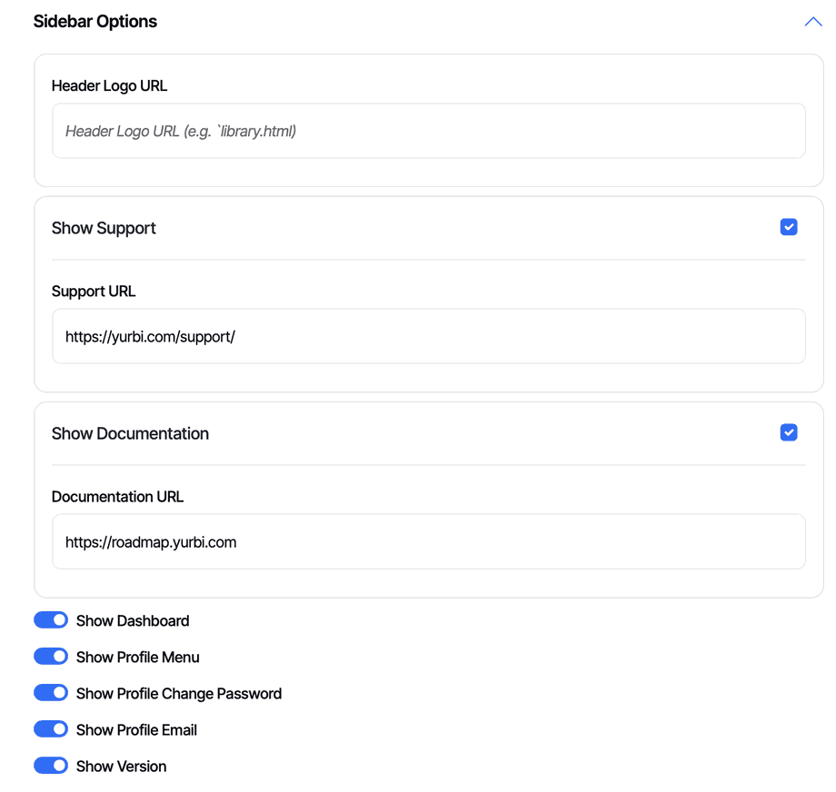 Sidebar Options control the navigation and links users see in the main Yurbi sidebar.