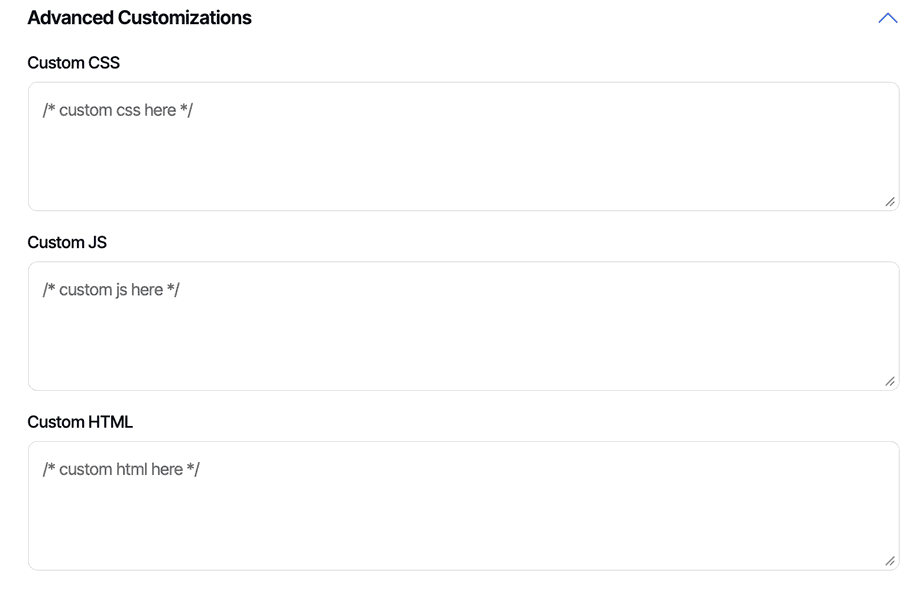 Custom JS (JavaScript) Add interactive functionality or integrate with external tools: