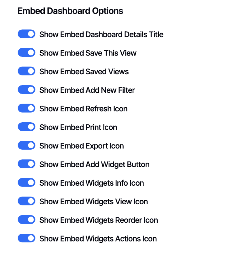 - Show Embed Add New Filter - Enable adding filters to the dashboard