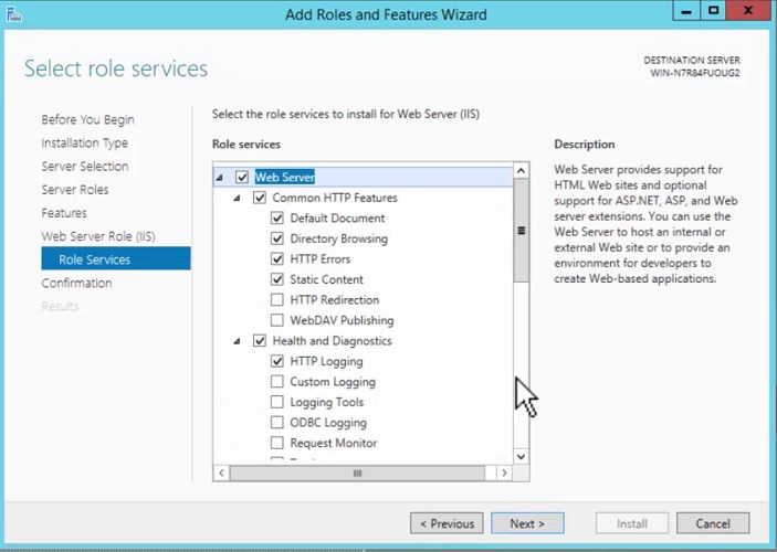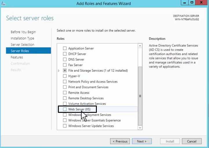 3. In the Server Roles screen, select the Web Server (IIS) check box.