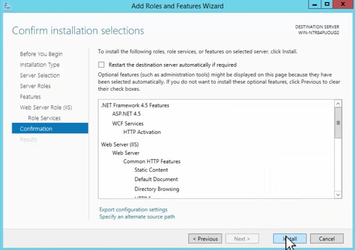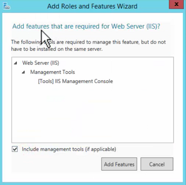 4. A message appears listing the features required for Web Server (IIS). Click Add Features to add the listed features and proceed.