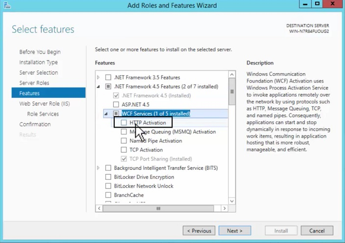 6. Go to .NET Framework 4.5 Features > WCF Services and select the HTTP Activation check box.