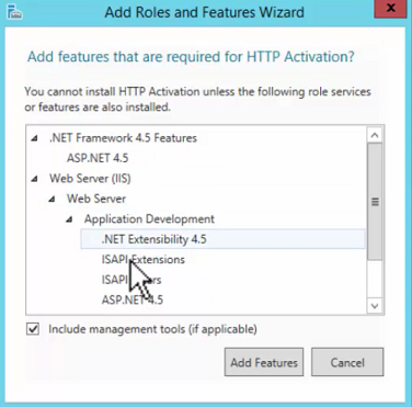 7. A message appears listing the features required for HTTP Activation. Click Add Features to add the listed feature and proceed.