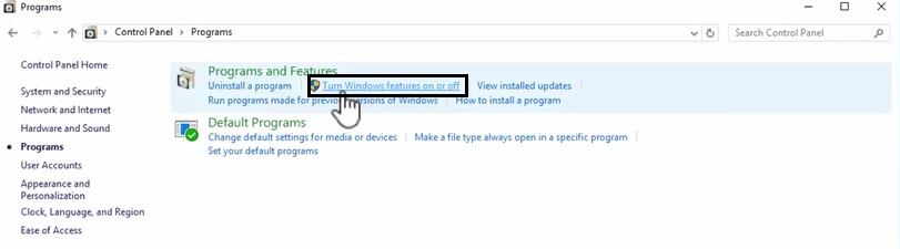 1. Go to the Control Panel > Programs > Programs and Features and click Turn Windows features on or off.