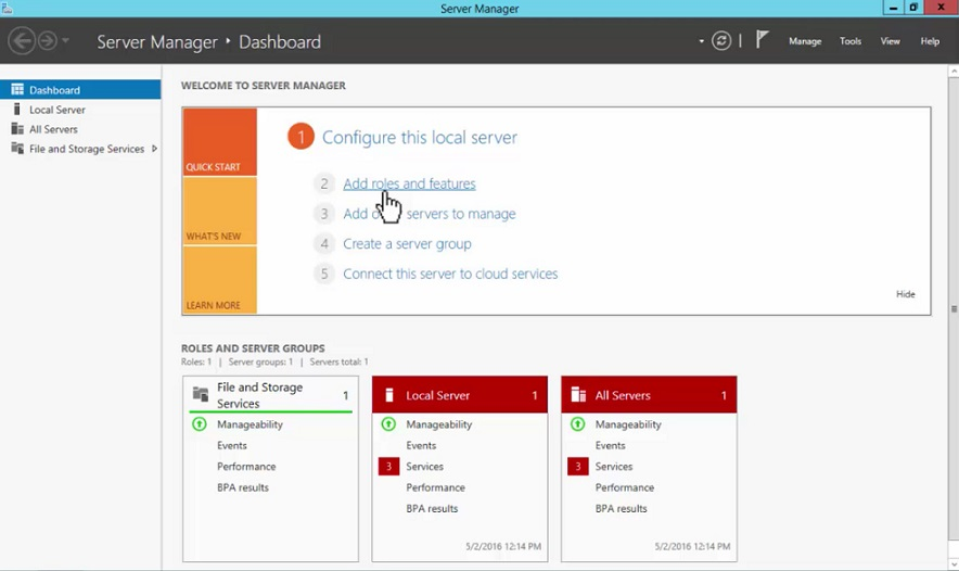 1. Go to the Server Manager > Dashboard and click Add roles and Features. The Add Roles and Features Wizard appears.
