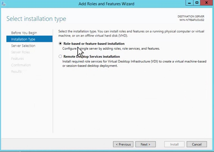 3. Select the installation type Role-based or feature-based installation, click Next, and proceed to the Server Roles screen.