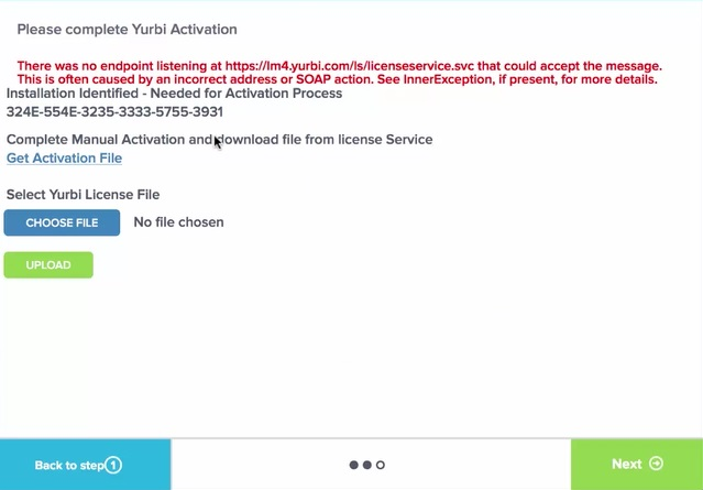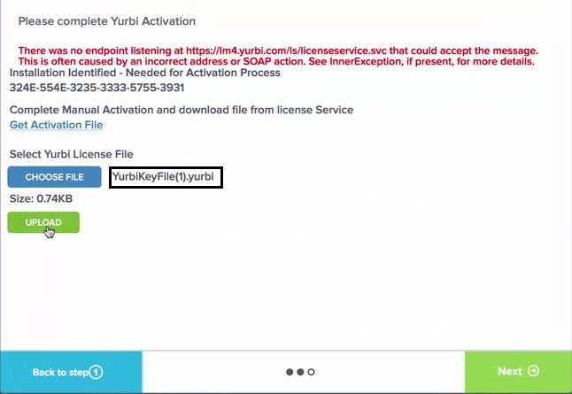 13. Go to the Yurbi Activation screen and click Choose File to select the downloaded product key file. The product key file will have the .yurbi extension.