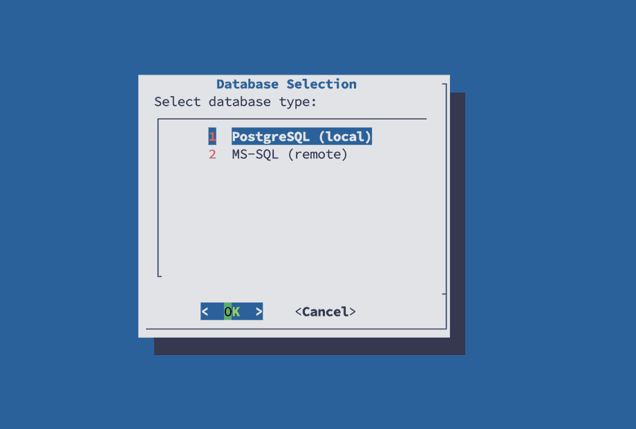 Press Enter to select the embedded PostgreSQL database to be used as the Yurbi backend.