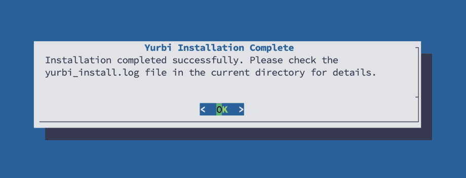 Upon completion of the script, you will see this dialogue. The results of the install are located at /root/yurbi_install.log.