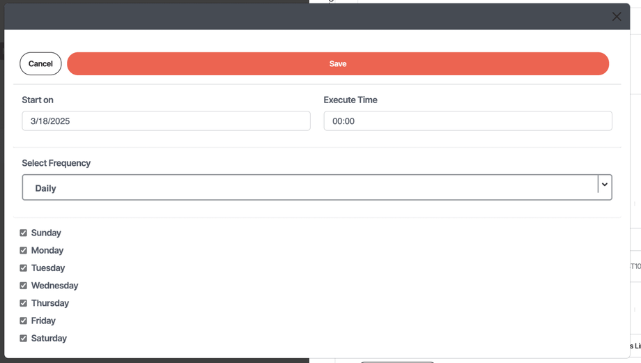 - For minute-based scheduling, enter the interval (we recommend a minimum of 15 minutes—for example, 60 minutes for an hourly fetch).