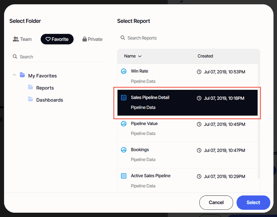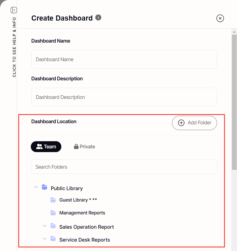- If you select the Team, you’ll see a list of available Public library folders. Depending on your permissions, you can also create a new library folder for your dashboard by clicking on Add Folder