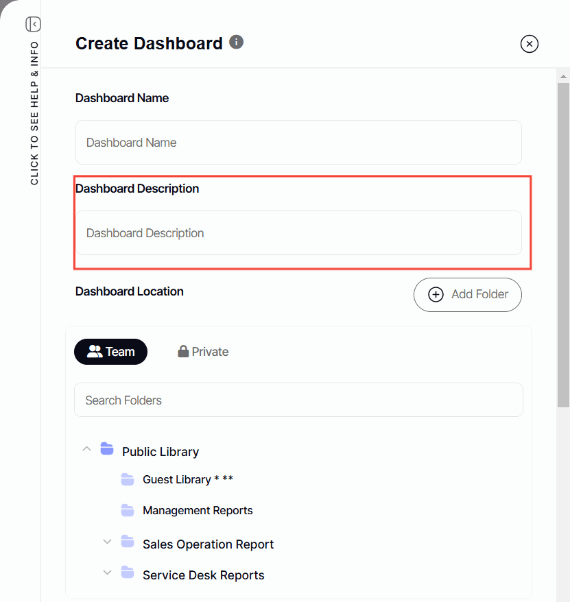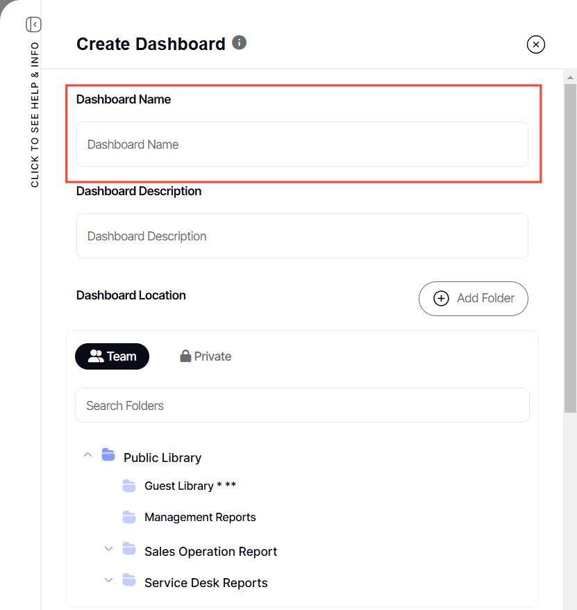 3. Dashboard Location (required): Select the folder where you want to save the dashboard in - either in the Team or Private.