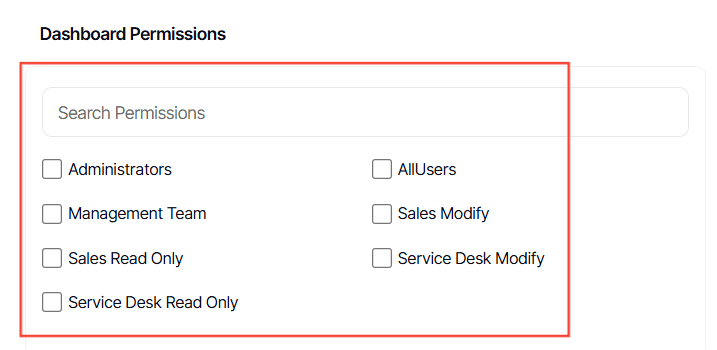 Note: You can select one, both, or leave them unchecked. Also, if you assign a permission, only users in that permission group will be able to see or modify the dashboard. If you leave it blank, permissions will default to those of its parent folder.
