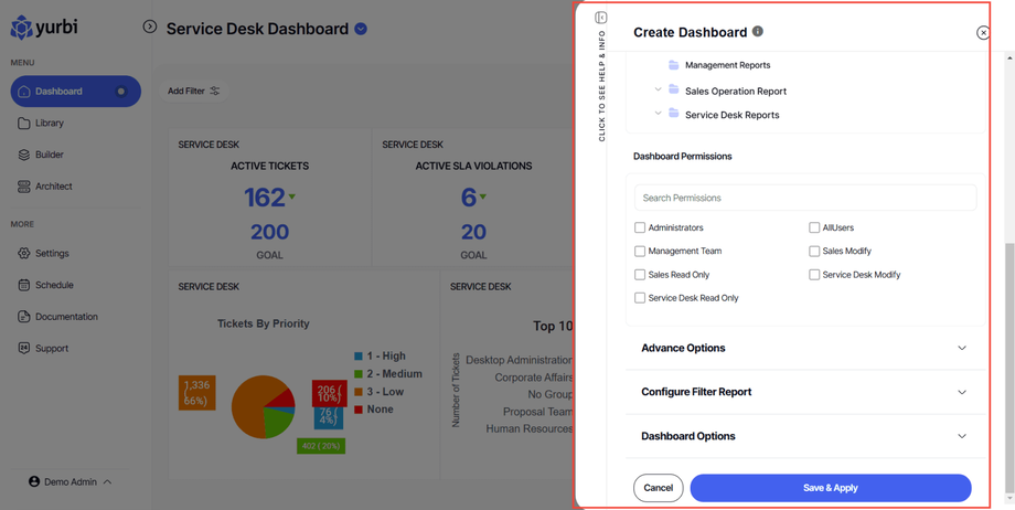A pop-up will appear on the right side where you can configure the dashboard you are creating. Here, you will enter your new dashboard name, dashboard description, choose the location to store your dashboard, dashboard permissions, advance options, configure filter report option, and dashboard options.