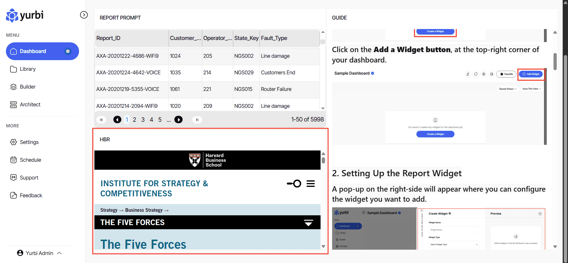 Page Embed Widget can be used to place a URL into the iframe of a dashboard. A common use case is having a web form, that has a link to the form which can be rendered and users can submit forms, etc., right from their dashboard. This type is very useful when placing a web file on the Yurbi server that has a custom visualization. If a developer builds a custom visualization it can be placed on the webfile in the Yurbi directory on the server and then link to it from there.