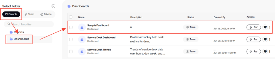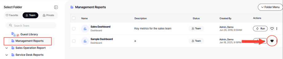 7. At the end of the reports, beside the Run button, just click the heart button and this will add the dashboard to your favorites section.